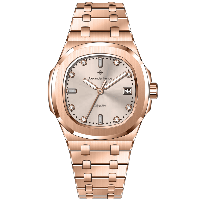 Alexander Ferros 6152R gây ấn tượng với thiết kế sang trọng, vỏ và dây đeo thép không gỉ mạ vàng hồng cao cấp. Mặt số tối giản nhưng tinh tế cùng bộ máy Nhật Bản bền bỉ, chính xác giúp sản phẩm trở thành lựa chọn lý tưởng cho những ai yêu thích sự đẳng cấp và hiện đại.