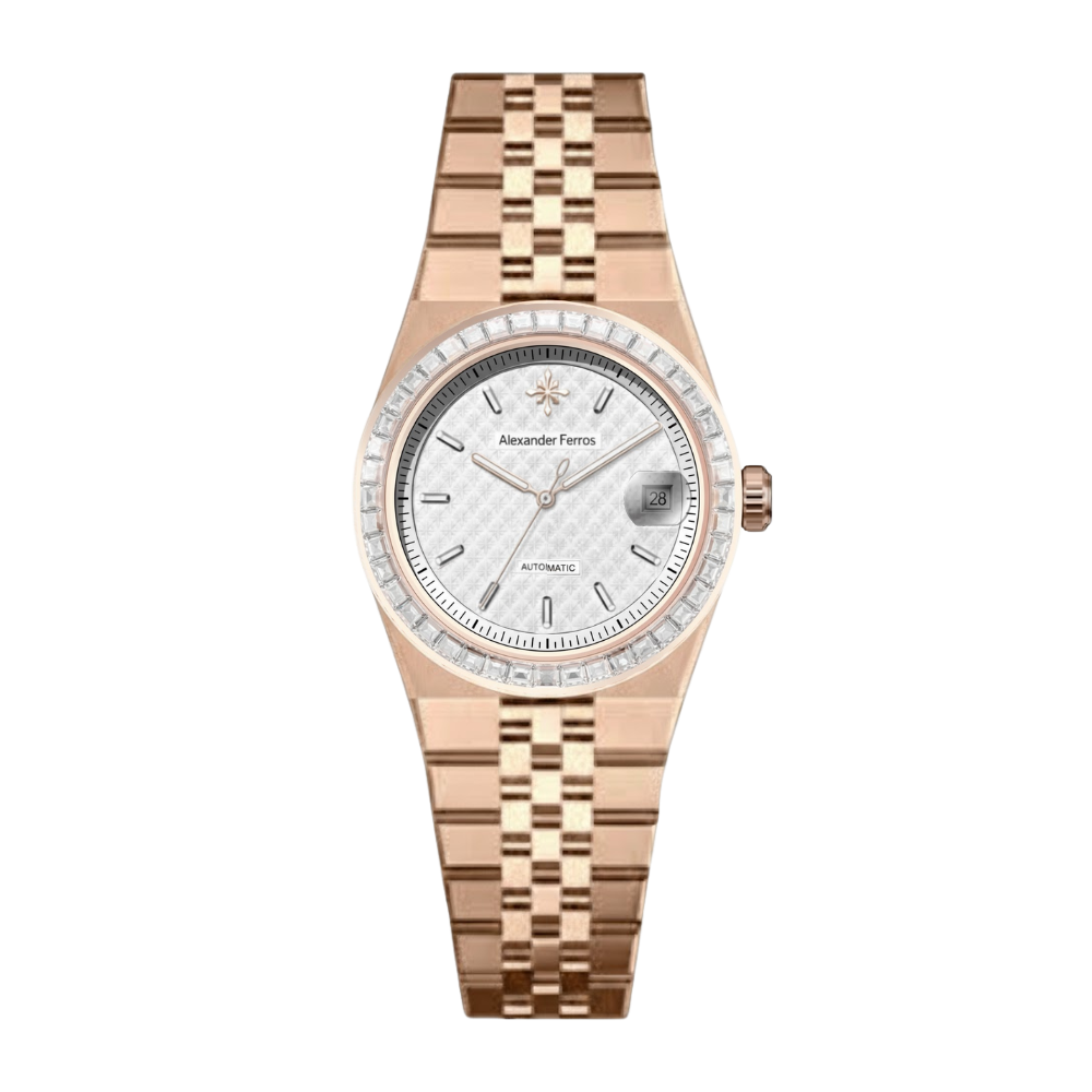 Alexander Ferros 8181R/022 là mẫu đồng hồ sang trọng dành cho những ai yêu thích vẻ đẹp tinh tế. Thiết kế dây demi vàng hồng cao cấp kết hợp mặt số bạc hoặc nâu thanh lịch, viền đá đính tỉ mỉ tạo điểm nhấn nổi bật. Bộ máy Nhật Bản vận hành ổn định, cùng kính sapphire chống trầy xước giúp sản phẩm bền bỉ theo thời gian. Đây là lựa chọn hoàn hảo cho cả công sở lẫn sự kiện.