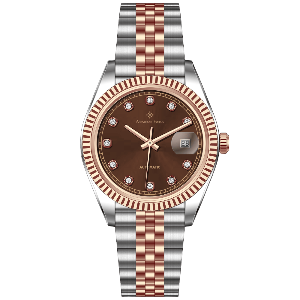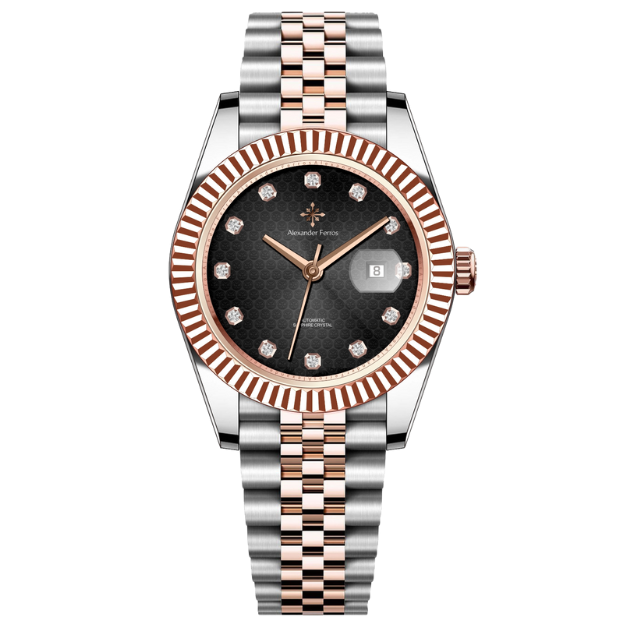 Đồng hồ nữ Alexander Ferros 8192 là mẫu phụ kiện lý tưởng cho phái đẹp yêu thích sự thanh lịch và sang trọng. Sản phẩm sở hữu thiết kế dây demi vàng hồng – bạc hiện đại kết hợp với viền khía nổi bật, mang đến vẻ đẹp thời thượng và tinh tế. Mặt số có ba lựa chọn màu sắc: xanh, đen và nâu, phù hợp với nhiều phong cách và sở thích khác nhau.